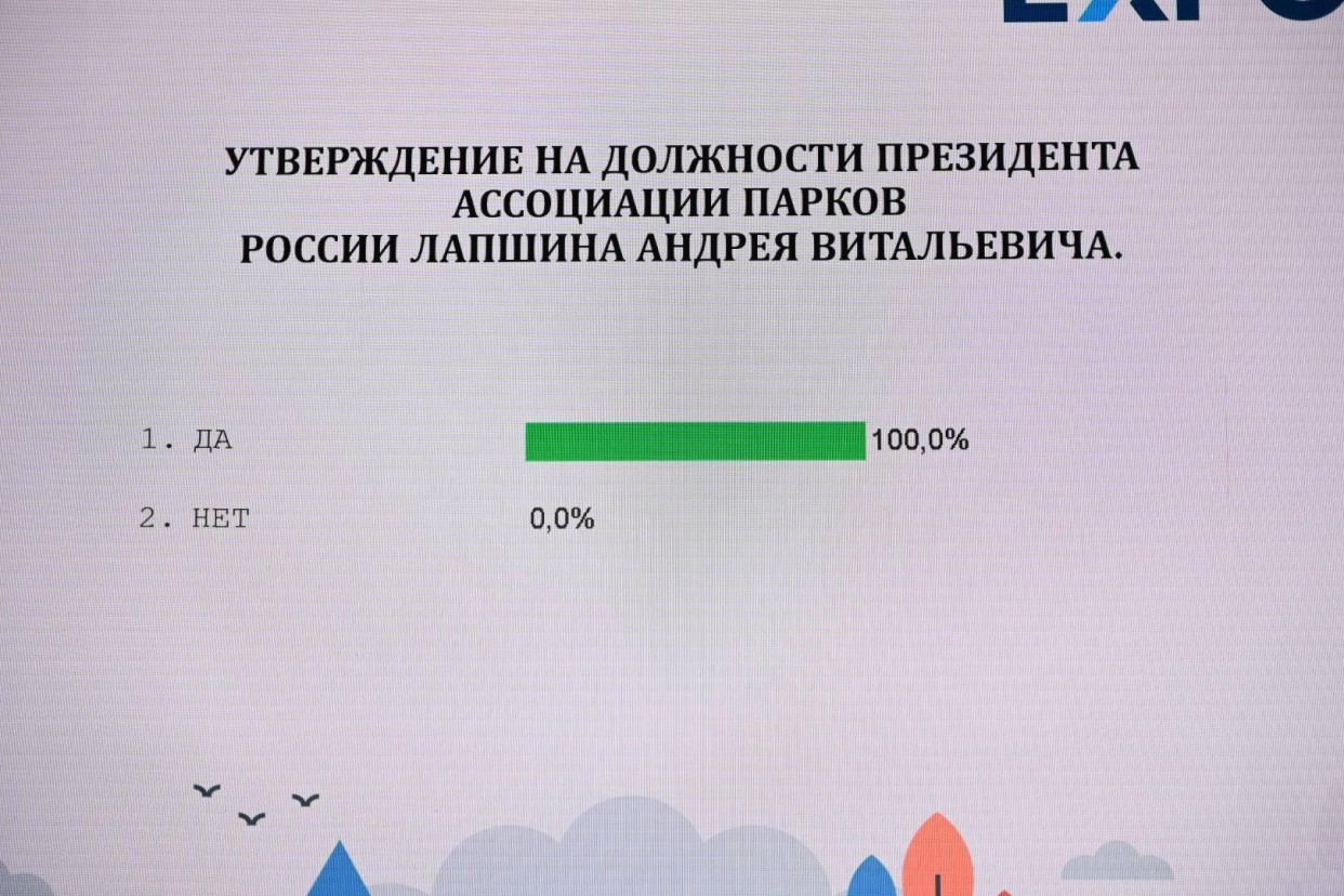 На Общем расширенном собрании членов Ассоциации парков России в рамках ParkSeason Expo Андрей Лапшин был единогласно утвержден в статусе Президента Ассоциации парков России. Интерактивное голосование провел директор АПР Денис Цуканов. На повестку были вынесены вопросы о создании должности «Президент» и далее о выдвижении на данный пост члена Совета АПР Андрея Лапшина. Участники большинством голосов утвердили новую должность, а далее единогласно избрали Президента. Поздравляем Андрея Витальевича с новой позицией в структуре главного паркового сообщества Российской Федерации.